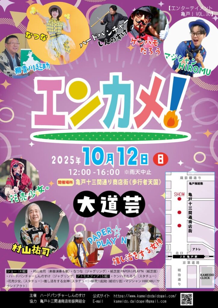 ※大道芸のタイムテーブルはありません。当日の状況を各パフォーマーが判断して実施します。当日の最新情報は、エンターテイメント亀戸!X(Twitter)アカウントにてお知らせしますので、ぜひチェックお願いします。