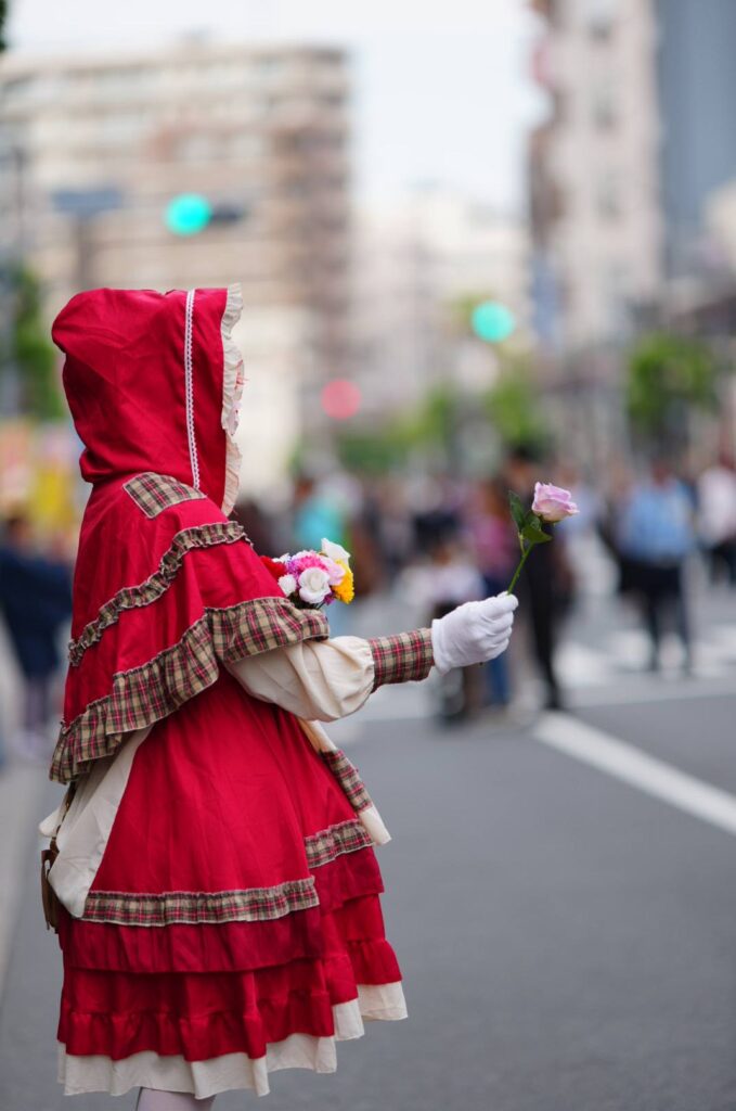道端に佇む花売少女。の可憐さは、女の子を中心に、道行くひとの心に花を咲かせます。