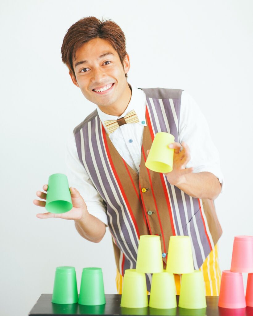 カップをピラミッドの形に積み上げて崩すまでの速さを競う「スポーツスタッキング」で世界チャンピオンになった実力と、様々なカップや高度なテクニックを組み合わせた「カップバラエティーショー」を確立。お茶目でスタイリッシュで優しい人柄溢れるショーをお届けします♪