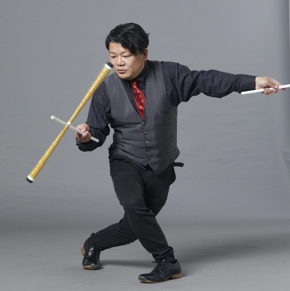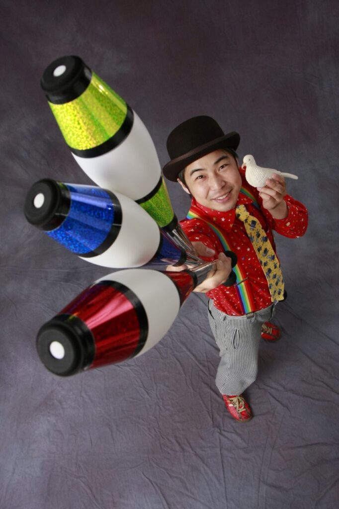 東京都公認のヘブンアーティストを取得。2002年にシカゴでバルーンパフォーマンスの世界チャンピオンに輝き、ディアボロと言うコマの芸を主軸にバルーンやマジック等を織り交ぜた、大人から子供まで楽しめるコメディーショーになってます。