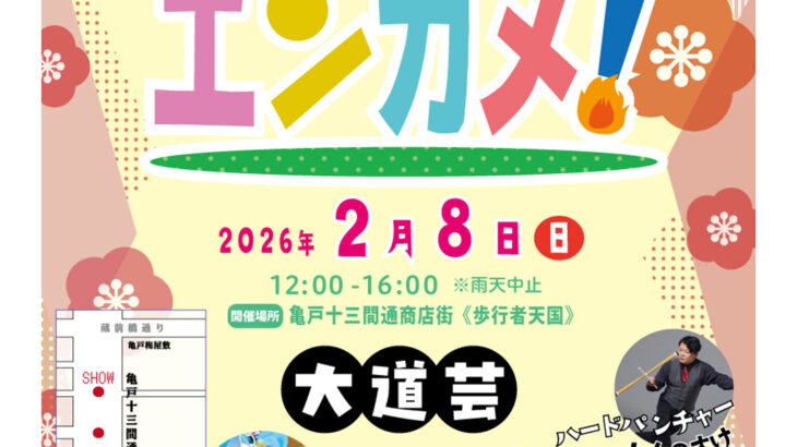 2026年最初の亀戸十三間通り歩行者天国が、キラキラ!ワクワク!楽しい不思議でいっぱいに始まります。 今年のエンカメ!の幕開けは、愉快で不思議なパフォーマーたちが集う、ハッピィでにぎやかな一日。新年の空気に包まれたホコ天で、笑顔と驚きが次々と生まれていきます。 […]